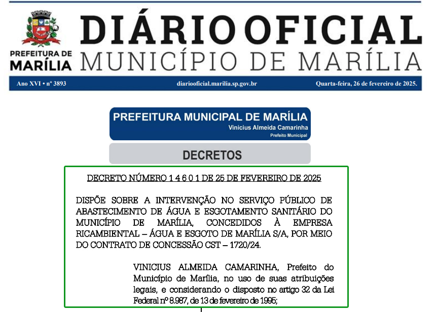 Ao mesmo tempo em que o prefeito Vinicius Camarinha dá entrevista coletiva à imprensa, explicando mais detalhes do decreto que determinou a intervenção na RIC Ambiental, a diretoria da empresa também está reunida com o departamento jurídico para avaliar possíveis medidas judiciais que garantam o prosseguimento do contrato com a Prefeitura. Confira o decreto clicando AQUI.