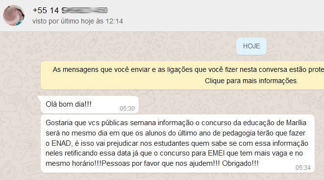 Mensagem, via WhatsApp, enviada por internauta ao Visão Notícias.