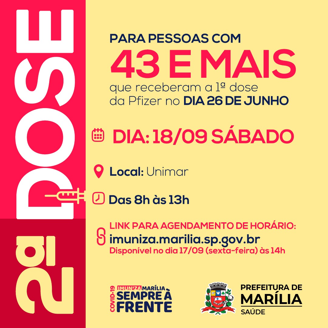 A Secretaria Municipal da Saúde de Marília agendou uma nova ação de vacinação da segunda dose da vacina contra a Covid-19 para a população de 43 anos e mais, que recebeu a primeira dose da Pfizer no último dia 26 de junho.