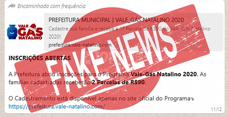 As mensagens falsas envolvem inscrições para o suposto "programa Vale-Gás Natalino 2020" e também a distribuição de cestas de Natal.