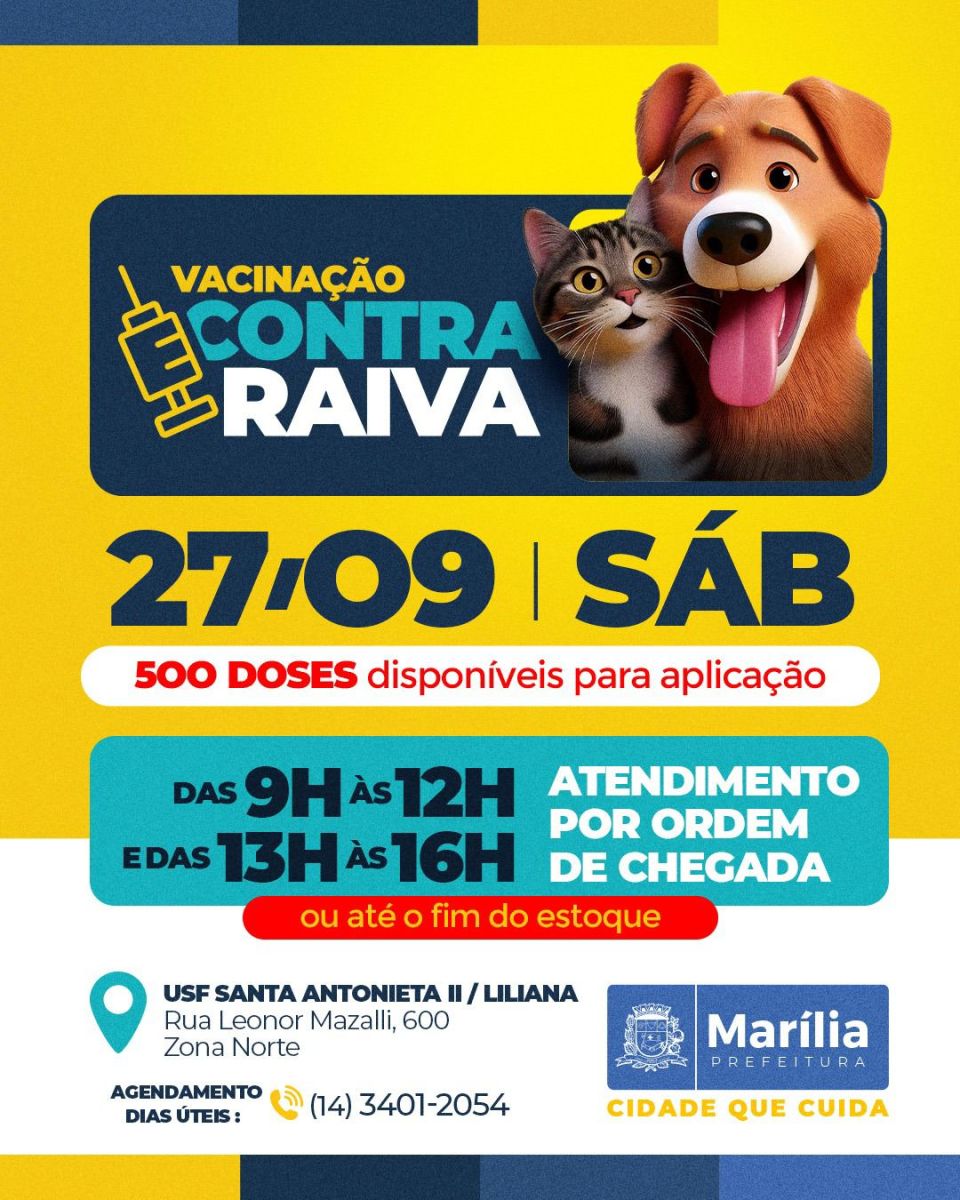 A Secretaria Municipal da Saúde de Marília vai realizar no próximo sábado (dia 27) nos períodos da manhã (das 9h às 12h) e da tarde (das 13h às 16h), ou enquanto durar o estoque, a 8ª ação de vacinação antirrábica do ano.