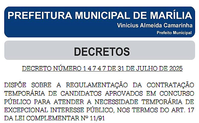 A Prefeitura de Marília autorizou a contratação temporária de candidatos aprovados em concurso público para atender a necessidade da Rede Municipal de Ensino. Os contratados vão exercer as mesmas atribuições dos cargos correspondentes e farão jus ao vencimento equivalente ao Nível 1 – Classe A das tabelas de hora-aula, conforme a legislação específica. Confira o decreto, clicando AQUI.