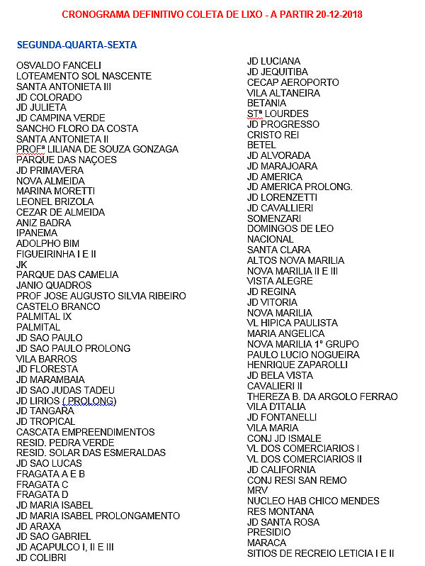 A Prefeitura de Marília inicia a partir desta quinta-feira (20) um cronograma da coleta de lixo. Pela nova medida, o trabalho dos coletores será realizado vezes por semana.