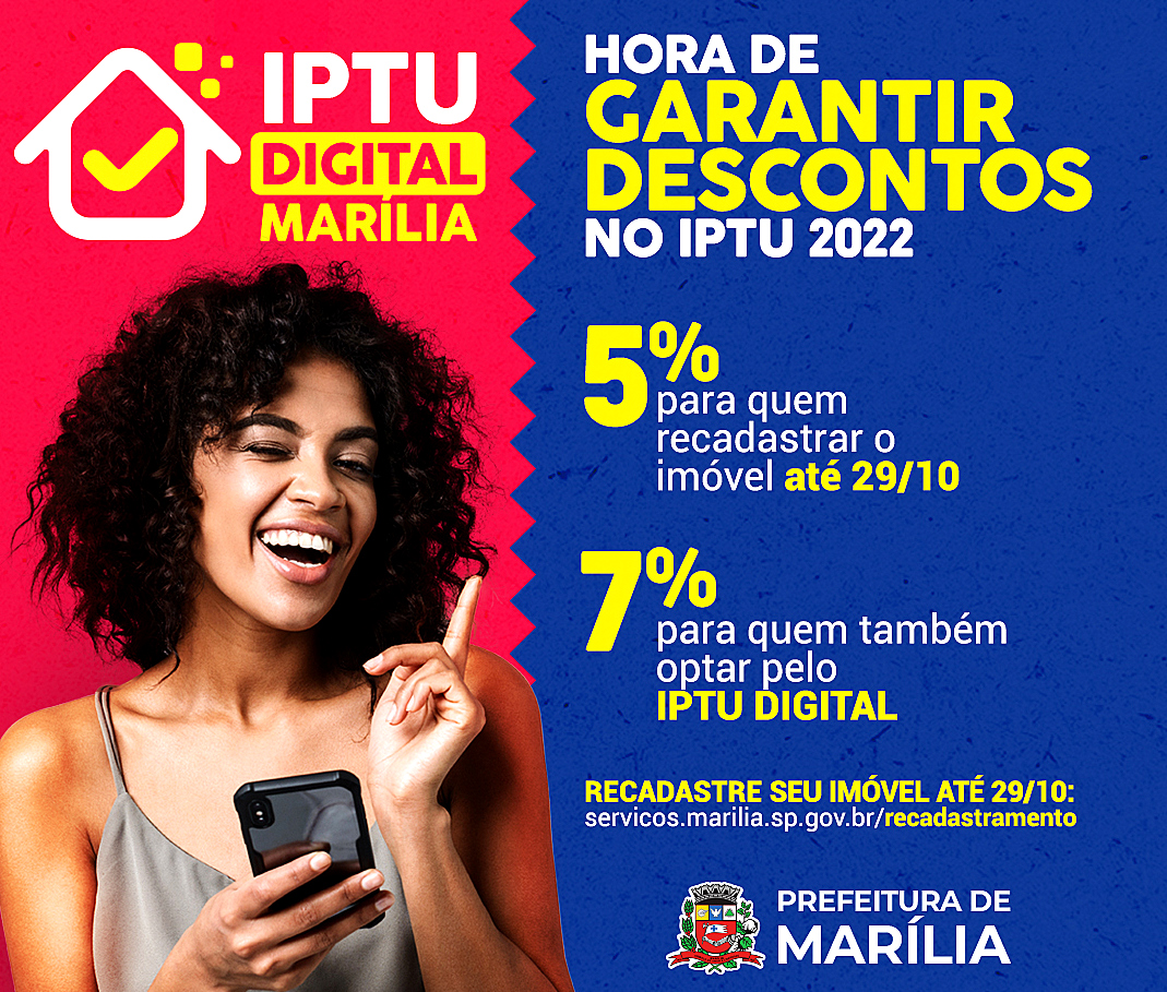 A Prefeitura de Marília, por meio das secretarias municipais de Tecnologia da Informação e da Fazenda, está lançando o IPTU Digital, sendo uma opção ao contribuinte fará no recadastramento do imóvel, cujo prazo vai até o próximo dia 29 de outubro de 2021.