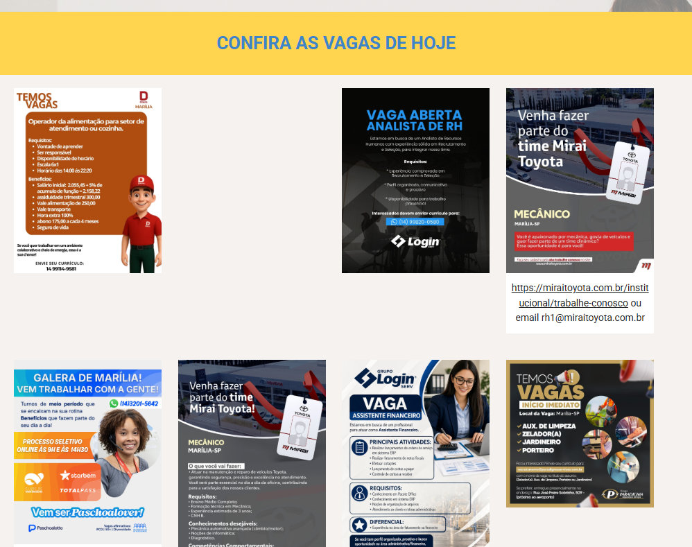 A plataforma reúne, em um único ambiente, vagas encaminhadas diretamente pelas empresas à Diretoria do Trabalho, responsável por organizar e disponibilizar as informações com os respectivos links oficiais para candidatura. Com isso, os interessados podem acessar as oportunidades e ser direcionados imediatamente às empresas contratantes, tornando o processo seletivo mais ágil e eficiente.