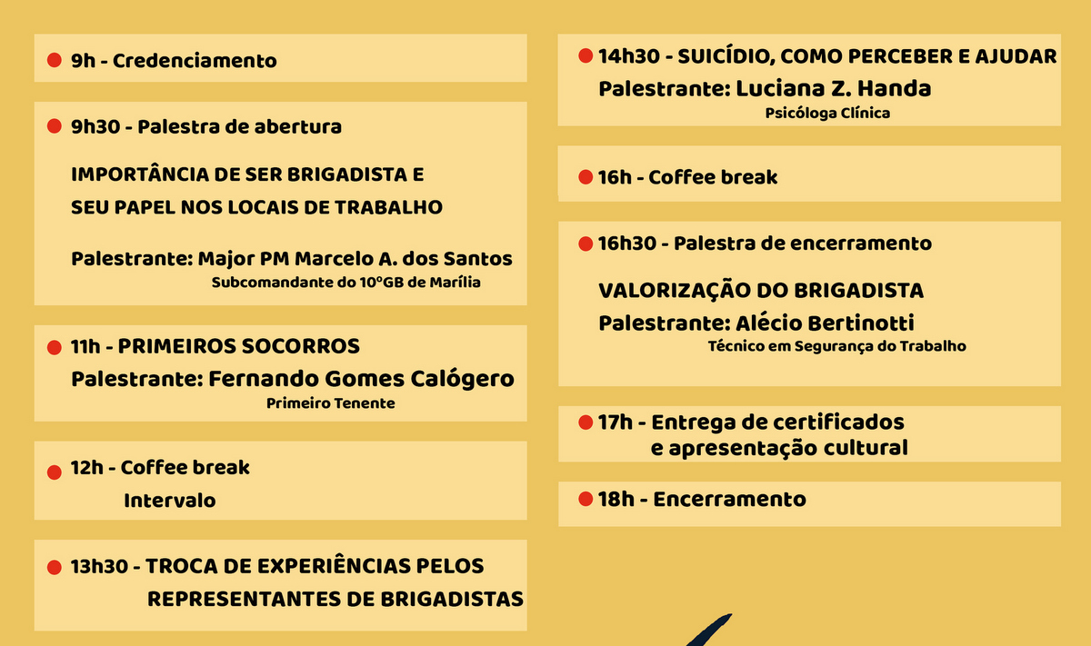 A Prefeitura de Marília promove na próxima quarta-feira (17) o 1º Encontro de Brigadistas com servidores do Paço Municipal, Câmara e Anexos da administração. O encontro acontece no Teatro Municipal “Waldir Silveira Mello”, das 9h às 18h. Serão várias palestras e atividades participativas, com temas de interesse dos brigadistas e também dos servidores em geral.