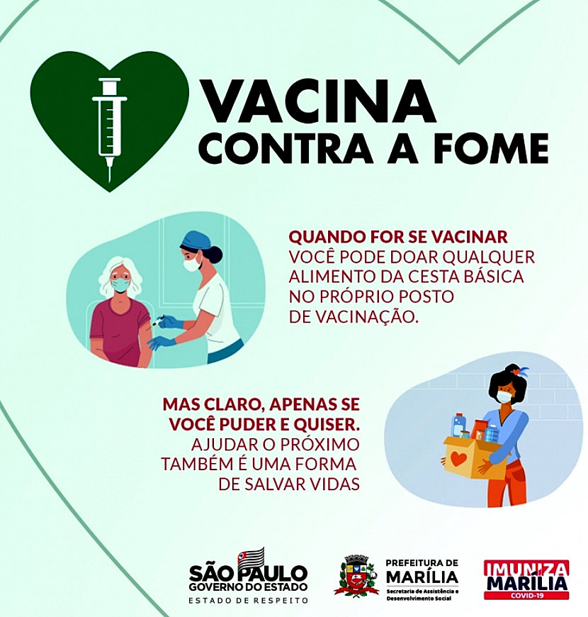A Prefeitura de Marília está reforçando a adesão da população a campanha “Vacina Contra a Fome”. Desenvolvida pelo Estado, a ação convida cada pessoa apta a se vacinar contra a Covid-19 a doar voluntariamente um quilo de alimento não perecível nos dias de vacinação.