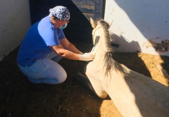 Segundo a profissional, chegando ao local a equipe se deparou com um potro caído em via pública com um grande edema anal, com muita miíase e magro.