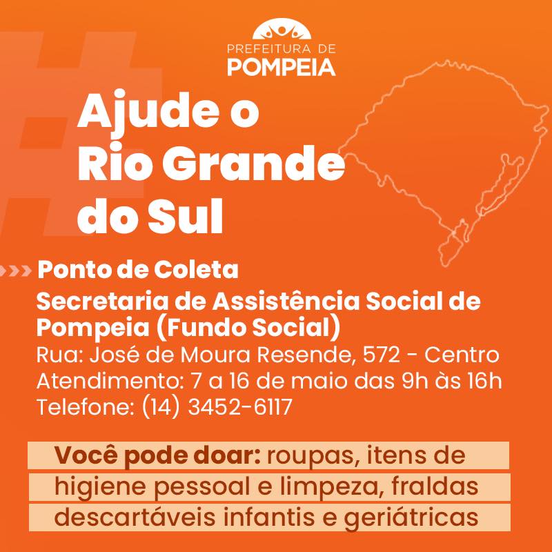 De um povo acolhedor e com amor ao próximo veio o título de Cidade Coração! Essa é Pompeia e mais uma vez vamos demonstrar a nossa força para ajudar o Rio Grande do Sul com um ponto de arrecadação na Assistência Social (Fundo Social). Sua doação é importante para trazer esperança e alívio às famílias que perderam tudo. É hora de nos unirmos e mostrar o nosso amor!