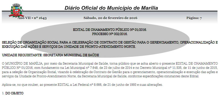 A UPA (Unidade de Pronto Atendimento) da zona Norte, em Marília, deverá funcionar por meio de uma terceirização. A Prefeitura publicou no fim de semana um edital de chamamento público às organizações sociais (OSCIP) interessadas em fazer um contrato de gerenciamento dos serviços. O valor previsto será de até R$ 18 milhões/ano, prevendo todos os serviços e também a contratação de funcionários. No começo da noite, a Prefeitura divulgou nota oficial informando que o Ministério da Saúde prorrogou o prazo para a entrada em funcionamento da UPA. Agora, a data limite é até o dia 19 de junho.