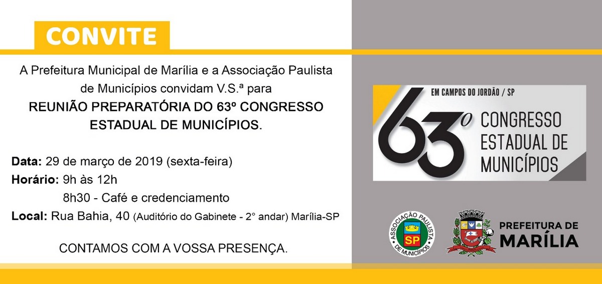 A Associação Paulista de Municípios e a Prefeitura de Marília realizam na próxima sexta-feira (dia 29), das 8h30 às 12h, no auditório do 2º andar do Paço Municipal, uma reunião preparatória ao 63º Congresso Estadual de Municípios da entidade. Neste ano o evento será realizado em Campos do Jordão.