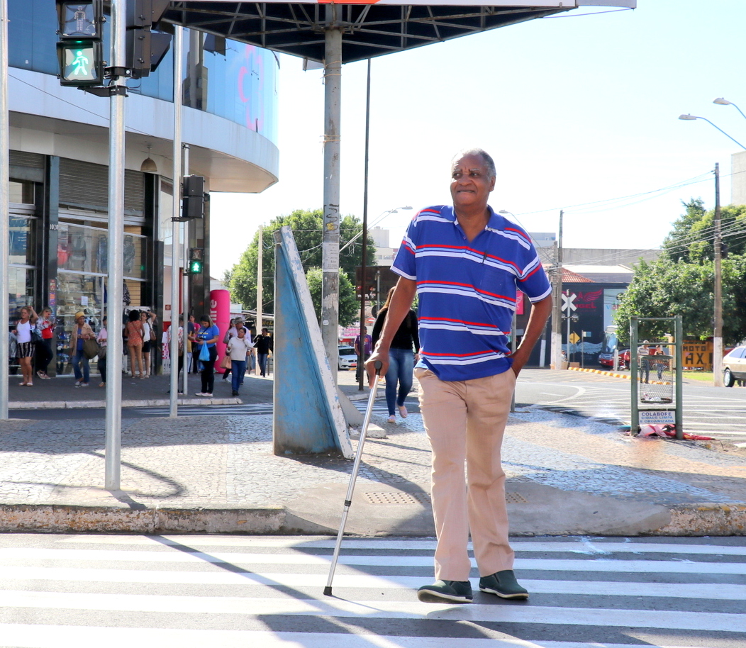 Após sofrer um AVC (Acidente Vascular Cerebral), o aposentado João Cruz de Campos, de 68 anos, passou a ter dificuldade para caminhar. Ele usa uma bengala e caminha lentamente. Para o idoso é um alívio ver sinalizado o cruzamento da rua 9 de Julho com a Tancredo Neves.