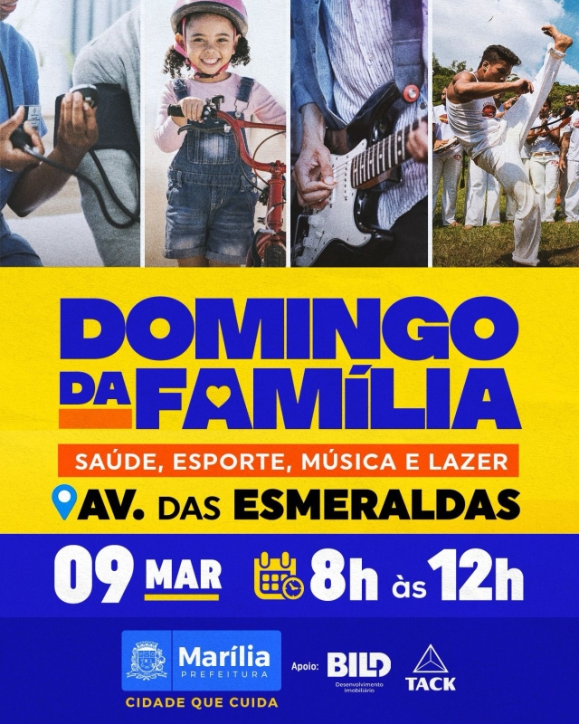 A Prefeitura de Marília, por meio da Emdurb (Empresa Municipal de Mobilidade Urbana de Marília) e das secretarias municipais da Cultura, da Saúde e de Esportes, Lazer e Juventude, promove hoje (dia 9) de março, na Avenida das Esmeraldas, zona Leste da cidade, o “Domingo da Família”.