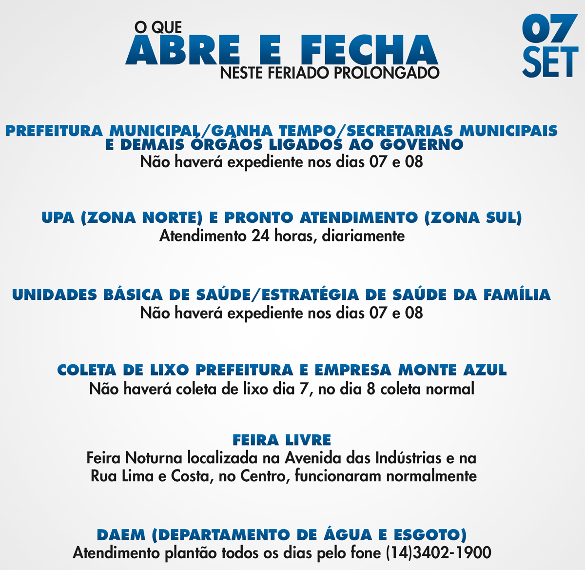 O feriado do dia 7 de Setembro está alterando a rotina dos serviços prestados pela Prefeitura. A coleta de lixo, por exemplo, será suspensa nesta quinta-feira, retornando ao normal na sexta, dia 8. Expediente em grande parte das Secretarias Municipais só vão retornar na segunda-feira (dia 121), às 8h, devido ao ponto facultativo na sexta. Nesses quatro dias apenas plantões (como saúde e água) estarão funcionando.
