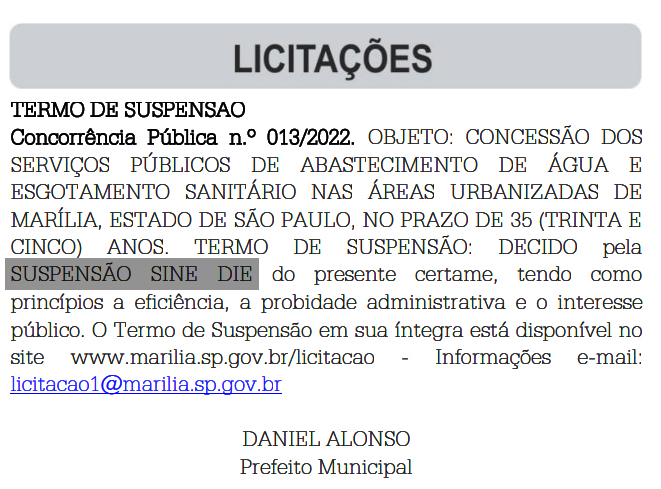 Prestes a completar dois anos (dia 16/12), a licitação de concessão do Departamento de Água e Esgoto de Marília (DAEM) à iniciativa privada foi novamente suspenso.
