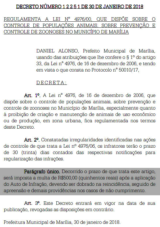 Pelo decreto, os criadores desses animais, após a notificação, terão 30 dias para regularizar a situação. Quem não cumprir a medida será multado em R$ 500,00, dobrando em caso de reincindência "seguido de apreensão e demais providências nos casos de não cumprimento", conforme prevê o decreto.