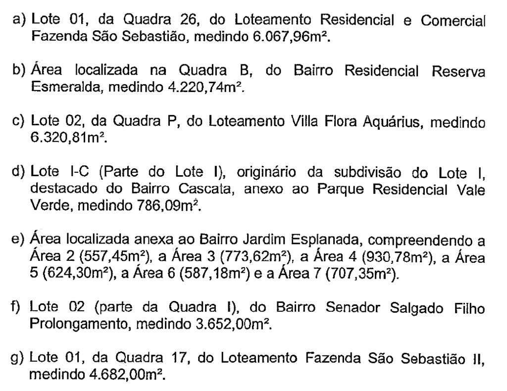 Dois projetos enviados pela Prefeitura, relacionados a venda de áreas públicas, serão analisados pelos vereadores durante sessão ordinária desta segunda-feira (27), a partir das 17h. O primeiro deles é o que regulamenta essa alienação (será por concorrência ou leilão público) e em seguida já escolhe 12 áreas em sete loteamentos da cidade, inclusive no bairro residencial Reserva Esmeralda, localizado em área nobre da cidade.