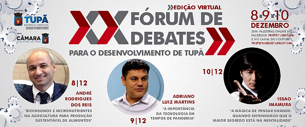 A Secretaria Municipal de Desenvolvimento Econômico e Comércio Exterior de Tupã realiza, a partir desta terça-feira, a vigésima edição do Fórum de Debates para o Desenvolvimento de Tupã. Entre os palestrantes, estará o presidente da Associação Comercial e Industrial de Marília, Adriano Luiz Martins.