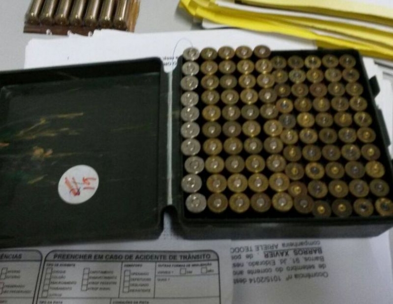 No local, foram encontrados um revólver, calibre 38, cerca de 60 munições, do mesmo calibre, e cheques falsificados.