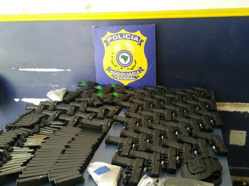 Cinquenta e cinco pistolas foram apreendidas na tarde desta quarta-feira (21) na Serra das Araras, em Piraí, RJ. De acordo com as primeiras informações da Polícia Rodoviária Federal (PRF), as armas, de 9mm, são de origem tcheca, turca e italiana — sendo essa última com mira a laser. Carregadores também foram apreendidos.