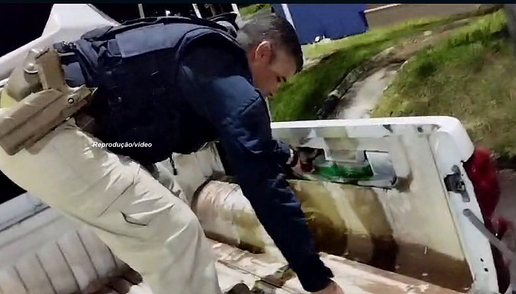 Por isso, o veículo foi inspecionado, sendo encontrado o contrabando, escondido na lateral da caçamba.