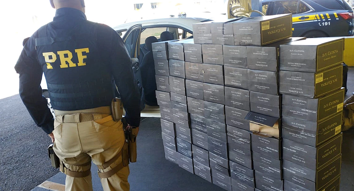 A Polícia Rodoviária Federal (PRF) apreendeu na tarde desta quinta-feira (18) uma grande quantidade de vinhos importados sem nota fiscal, o que caracterizou o contrabando. O material estava sendo transportado em um carro e o motorista confessou que iria receber R$ 500,00 pelo "serviço".