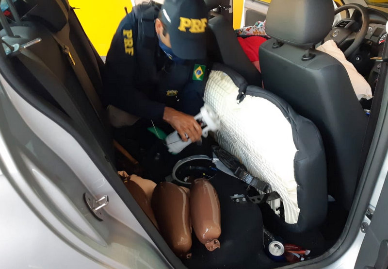 Os policiais encontraram aproximadamente 20 kg de pó branco, aparentando ser cloridrato de cocaína, no tanque de combustível de um Volkswagen Voyage.