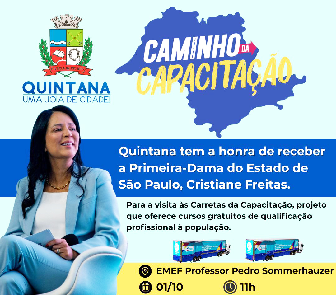 A primeira-dama do Estado de São Paulo e presidente do Fundo Social de Solidariedade São Paulo, Cristiane Freitas, estará em Quintana, nesta quarta-feira (01), às 11 horas. Ela terá como agenda principal visitar as carretas da capacitação – projeto que oferece cursos de capacitação gratuitos para a população.