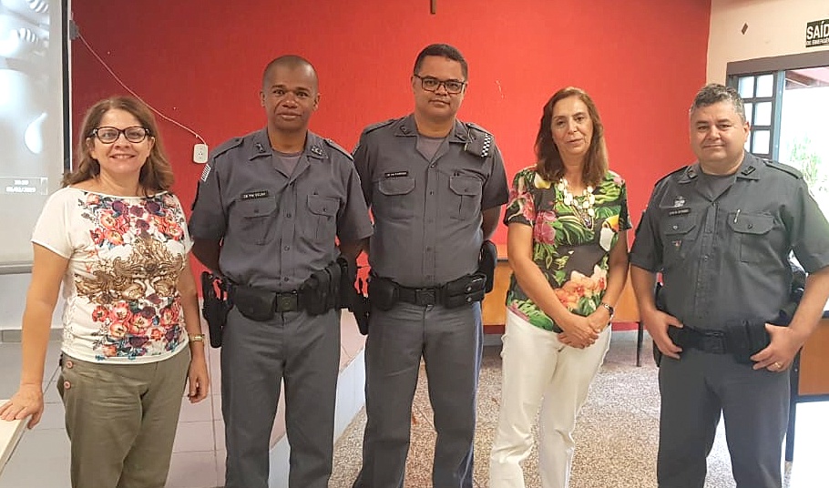 Policiais militares com representantes da ETEC. Tema da palestra teve muito interesse dos alunos.