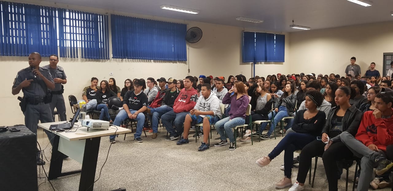 A palestra foi realizada no auditório da ETEC e ministrada pelos policiais cabos Cardoso e Celso que foram muito elogiados pela condução do tema.