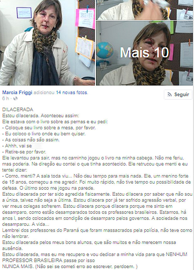 Em uma publicação feita no Facebook na tarde desta segunda-feira, Marcia deu detalhes do incidente, que ocorreu após ela ter pedido que o aluno colocasse o livro sobre a mesa.
