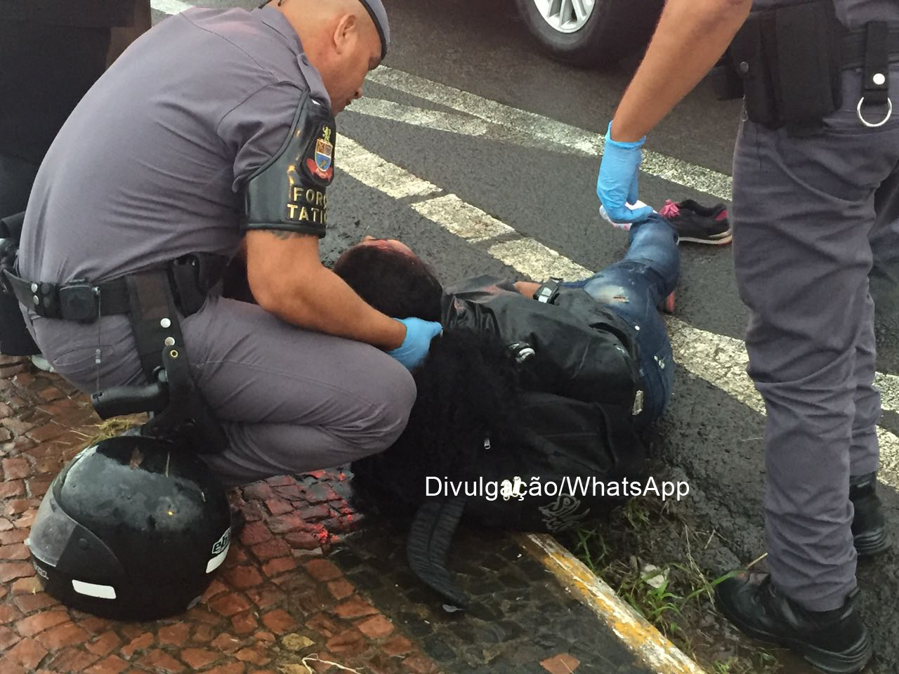 Uma viatura da Força Tática que passava pelo local prestou os primeiros-socorros à vítima até a chegada da Unidade de Resgate do Corpo de Bombeiros que a socorreu até o Pronto-Socorro do Hospital das Clínicas.
