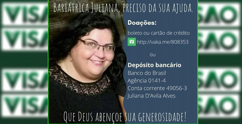 Com 210 quilos, a professora mariliense Juliana D'Ávila Alves, de 43 anos, tomou uma decisão duplamente corajosa: realizar uma cirurgia bariátrica (redução do estômago) e ao mesmo tempo realizar campanha com esse objetivo nas redes sociais. É que, sem condições financeiras, decidiu recorrer aos amigos para atingir esse objetivo.