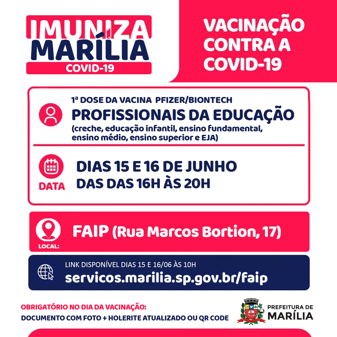 A Secretaria Municipal da Saúde estará realizando mais uma ação de vacinação contra a Covid-19 para os profissionais da educação na FAIP, zona norte da cidade.