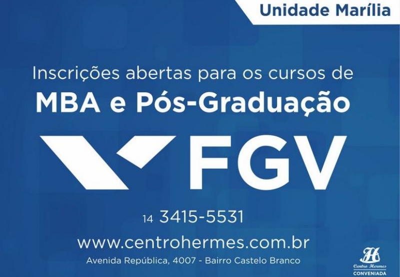O Centro Hermes conveniada da Fundação Getulio Vargas há 11 anos presente em Marília, está com inscrições abertas para seus programas de MBA, Pós-Graduação e Analista da FGV.