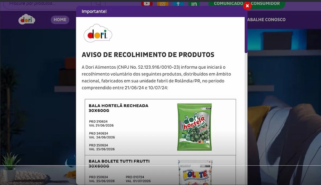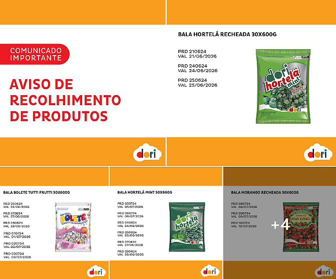 os consumidores que tenham adquirido produtos dos lotes citados, a Dori reforça que não consumam as balas e entrem em contato com o serviço de atendimento ao cliente da empresa para o esclarecimento de dúvidas e processo de reembolso.