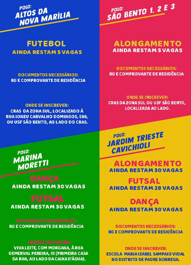 São oferecidas aulas gratuitas de futebol, futsal e alongamento; oportunidades nos núcleos da zona sul de Marília.