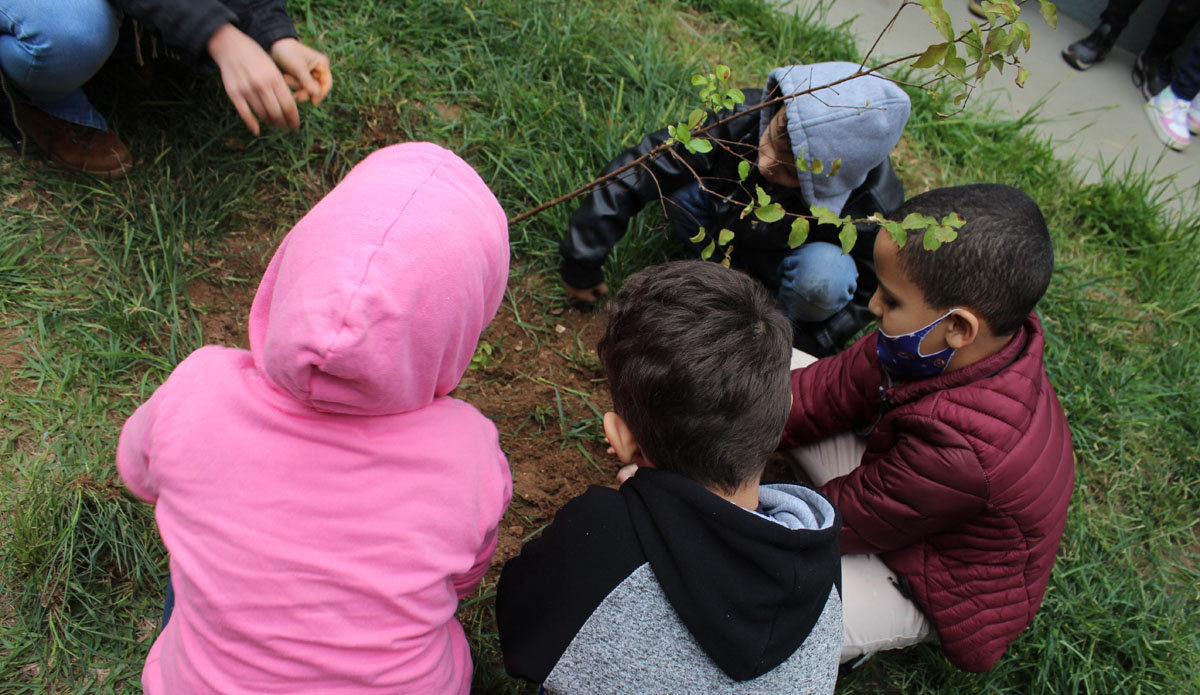 Filhos de colaboradores Unimed Marília ajudando no plantio em comemoração ao dia da árvore em setembro de 2021.