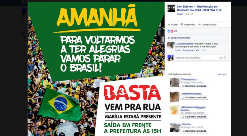Pelo menos 1.400 marilienses já confirmaram que estarão participando neste domingo (13), em Marília, da manifestação pelo impeachment da presidente Dilma Rousseff. A concentração está prevista para às 15h, em frente à Prefeitura (avenida Sampaio Vidal).