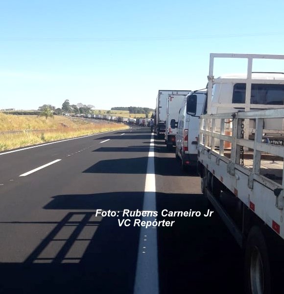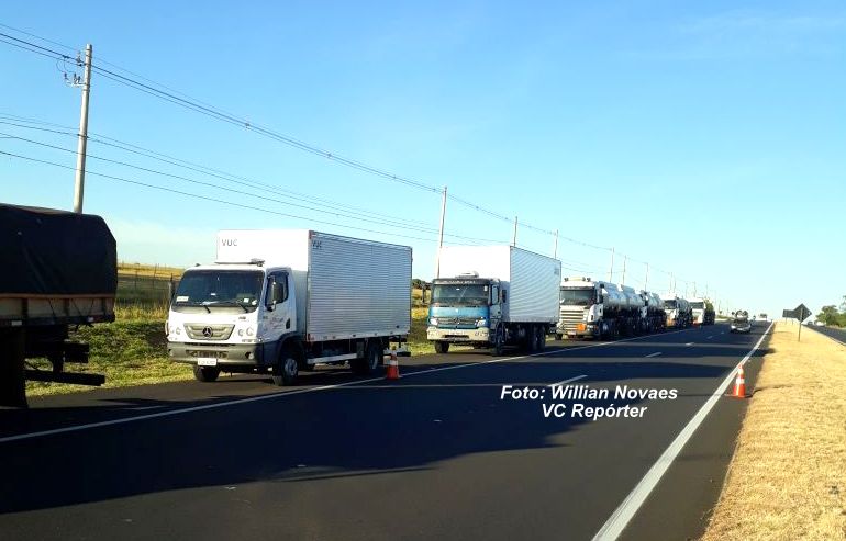 próximo ao município de Gália. De acordo com internautas, os caminhões estão parados no acostamento e a fila já chega a 2,5 km de cada lado. Apenas veículos de passeio estão sendo autorizados a seguir viagem.