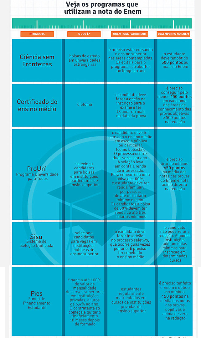 O Enem também é pré-requisito para firmar contratos pelo Fundo de Financiamento Estudantil (Fies), obter bolsas de intercâmbio pelo Programa Ciência sem Fronteiras e certificação do ensino médio.
