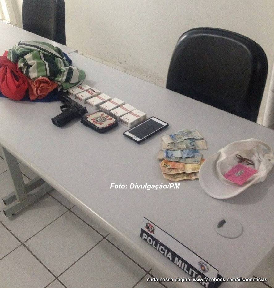 um cerco rapidamente em toda a região oeste e os suspeitos foram localizados na rua Borba Gato, próximo ao poliesportivo Pedro Sola. Com eles, foram localizados os cigarros e dinheiro roubados, bem como uma arma de brinquedo (simulacro) semelhante a uma pistola ponto 40.