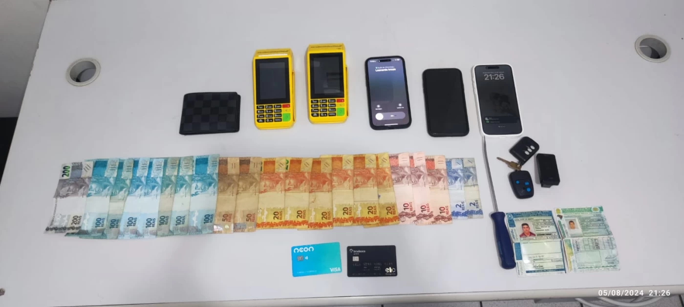 Ao fazer buscas, encontraram três controles semelhantes ao de portão eletrônico, porém que funcionavam como bloqueadores de alarme veicular, duas máquinas de cartão, três Iphones, uma chave de fenda, dois cartões de crédito, além da quantia de R$ 1.154,00..