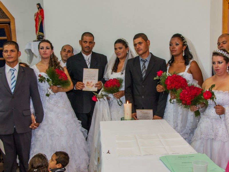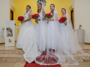 Com vestidos parecidos, as quatro noivas entraram na igreja com buquês vermelhos. Em seguida, o altar ficou lotado. Mas apesar de todos se darem muito bem, a família não consegue chegar a um consenso sobre o número de padrinhos que abençoaram os oito noivos. Alguns dizem 32, outros calculam 36. Para tirar a dúvida, o diácono Arnaldo José de Mello contou as assinaturas na ata e garante: foram 37 padrinhos.