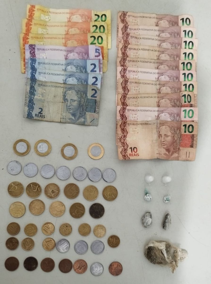 O segundo flagrante ocorreu na rua Tupi esquina com a rua Princesa Isabel, no bairro Araceli. Os policiais militares abordaram um homem vendendo entorpecentes. Foram apreendidos com ele drogas, como cocaína, maconha e crack, além de R$ 183,00, em diversas notas (foto).