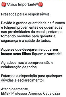 O problema é tanto que a direção da EMEF emitiu um comunicado (foto) aos pais para que busquem os alunos como forma de garantir a segurança e a saúde, mesmo porque a queimada está nas proximidades da escola.