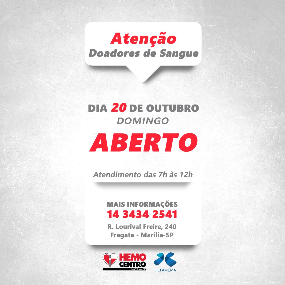 Serviço - O Hemocentro fica na Rua Lourival Freire, nº 240 – ao lado do Fórum, no Bairro Fragata. O horário de atendimento ao público é das 7h às 13h de segunda a sábado. Mais informações pelo telefone (14) 3402-1850.