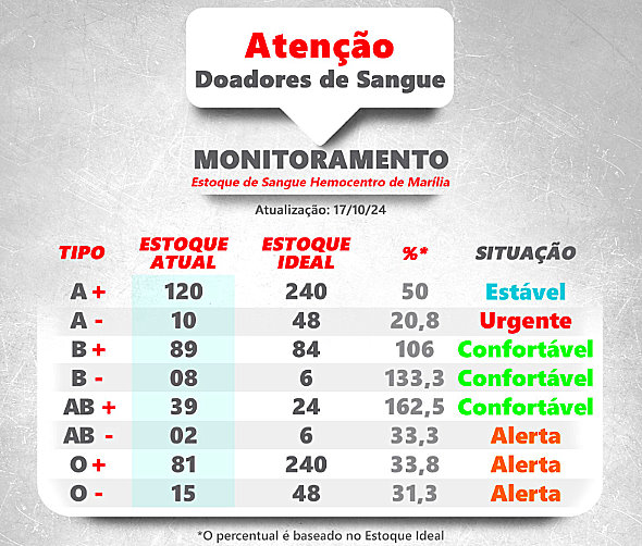 De acordo com o último levantamento oficial, o tipo sanguíneo mais preocupante (em relação ao estoque da unidade) é o tipo "A negativo": até sexta-feira estava com apenas 10 bolsas, sendo que o ideal seriam 48, ou seja, apenas 20% do necessário, colocando em risco a vida de pacientes.