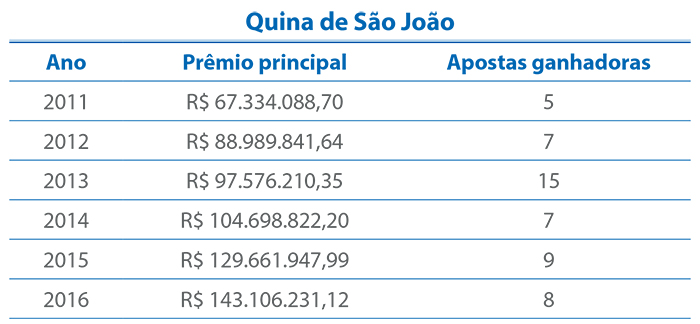 Esta é a sétima edição da Quina de São João. No ano passado, oito apostas dividiram o prêmio recorde de R$ 143 milhões – mais que o dobro do valor pago no primeiro sorteio do concurso especial. Em seis edições, apenas na faixa principal, a Quina de São João pagou R$ 631 milhões para 51 apostas de 32 cidades.