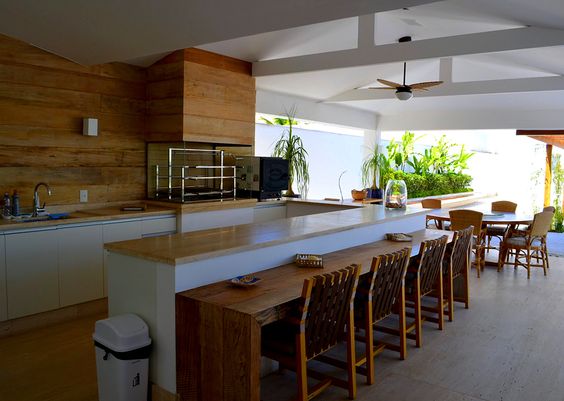 Na área do churrasco é interessante a integração entre a mesa e área da churrasqueira, de forma que as pessoas que preparam os alimentos estejam em contato com os convidados que aguardam a refeição.